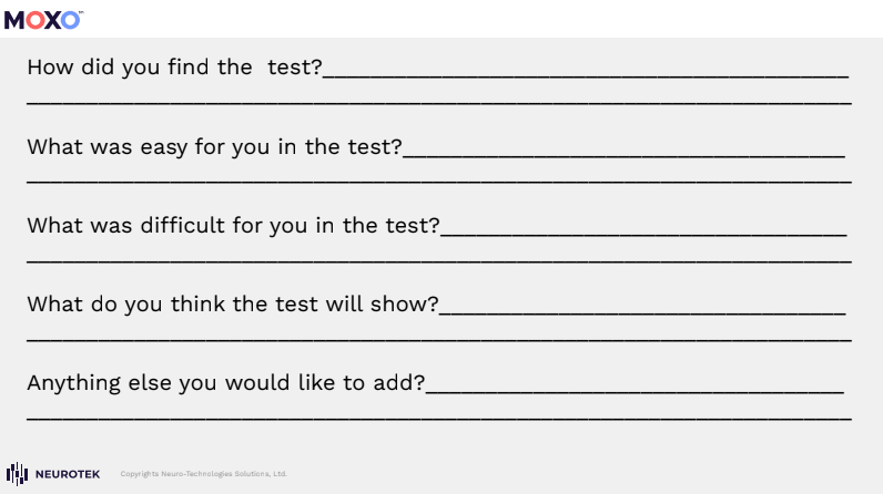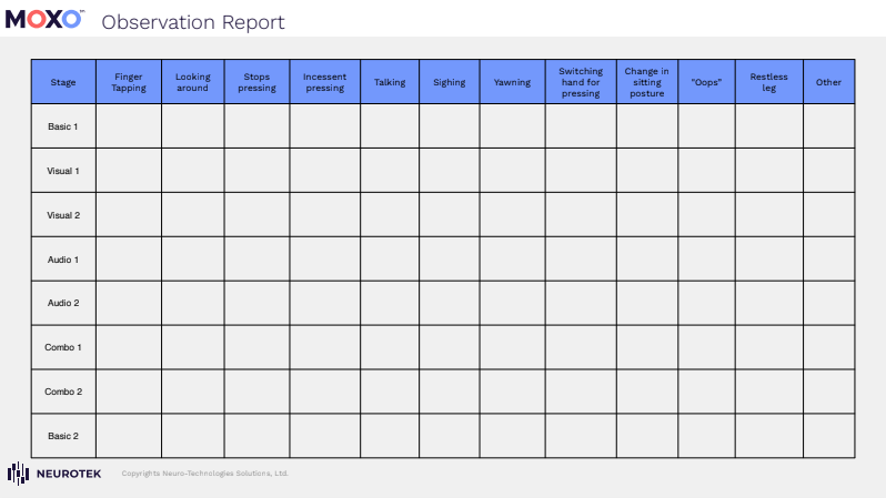 Observing the client’s movements and behaviors while performing the MOXO can provide insightful information, complementing the data provided by the assessment itself. To make the observation process as efficient as possible.